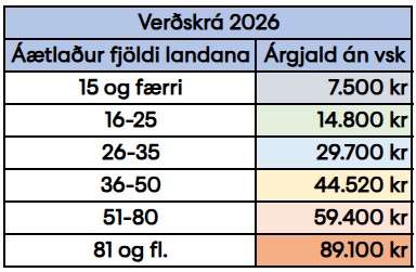 Verðskrá tekur mið af umfangi veiði. Innifalið í verðskrá er öll notkun kerfisins, framtíðaruppfærslur og rekstur. Aðstoð vegna bilana og við að bæta við eða halda utan um notendur er innifalin á þjónustutíma kl. 9:00–15:30 á virkum dögum.
